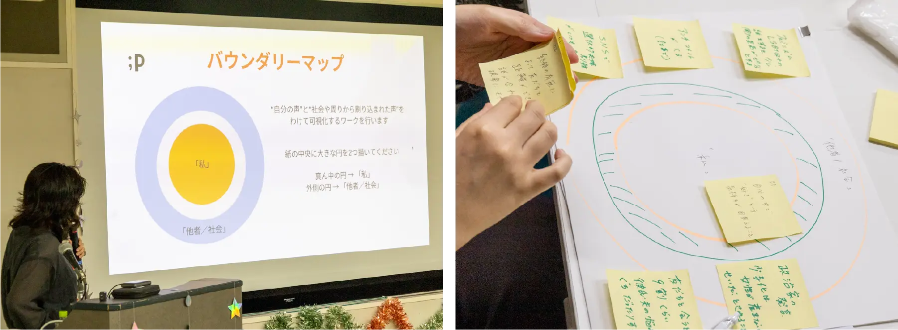 「客観的に自分の状態をとらえ、一人ひとりがバウンダリー(境界線)を持った存在であることを意識することで、心が少し楽になります。」と合田さん。自分自身を中心にした大きな円を描き、バウンダリー(境界線)マップを作ってみることで自分と社会の境界線を意識するワークが行われました。